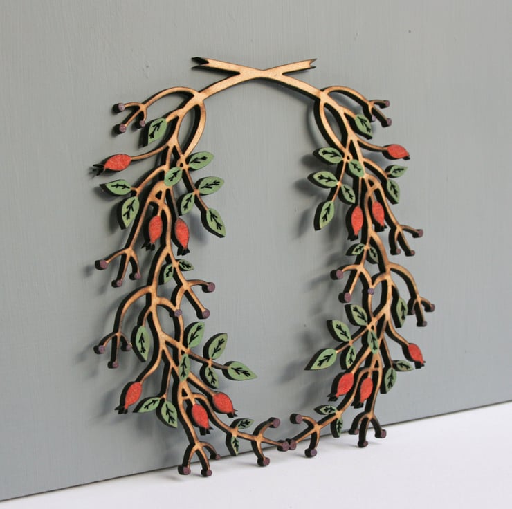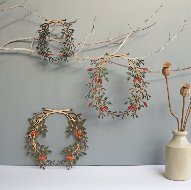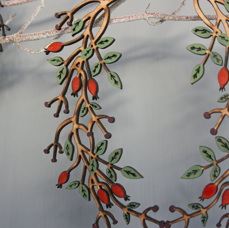This beautiful wooden hanging wreath is handmade by me and takes inspiration from the British countryside and wild hedgerows. This is one of three designs and measures 16cm diameter and arrives to you within a cello envelope that contains a small length of red and white twine which can be used to suspend it from. Made from 3.2mm thick MDF and is designed, laser cut and hand painted by me in my studio in Staffordshire.