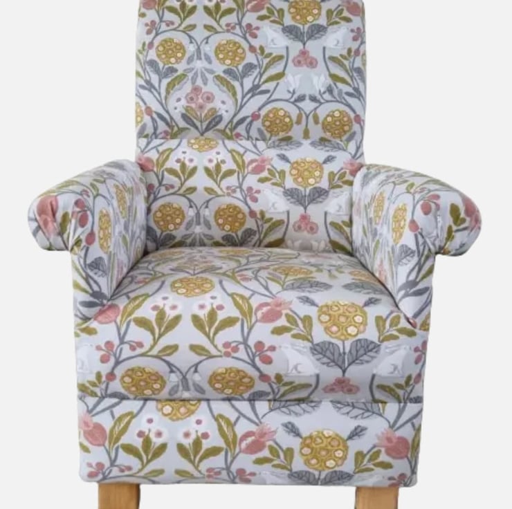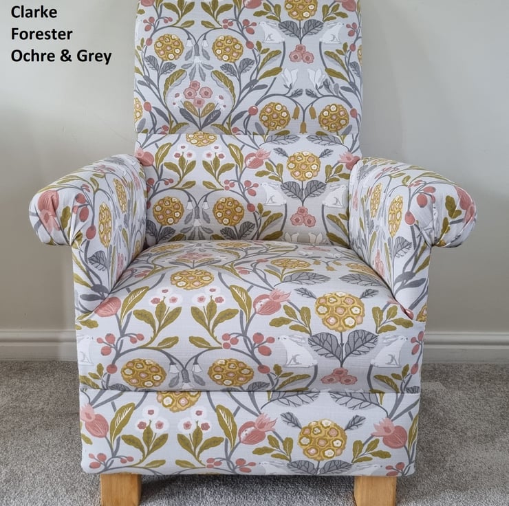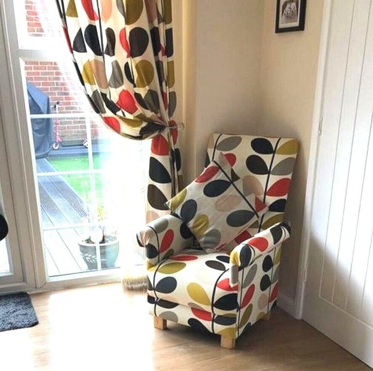 This lovely adult's armchair measures approximately 38 inches in height, by 26 inches wide and will look gorgeous in any room, and is a real accent piece of furniture. It has a wooden frame and has a fire retardant interliner, which makes it compliant with UK fire regulations. It is then upholstered entirely with this gorgeous fabric, and has solid wooden feet.