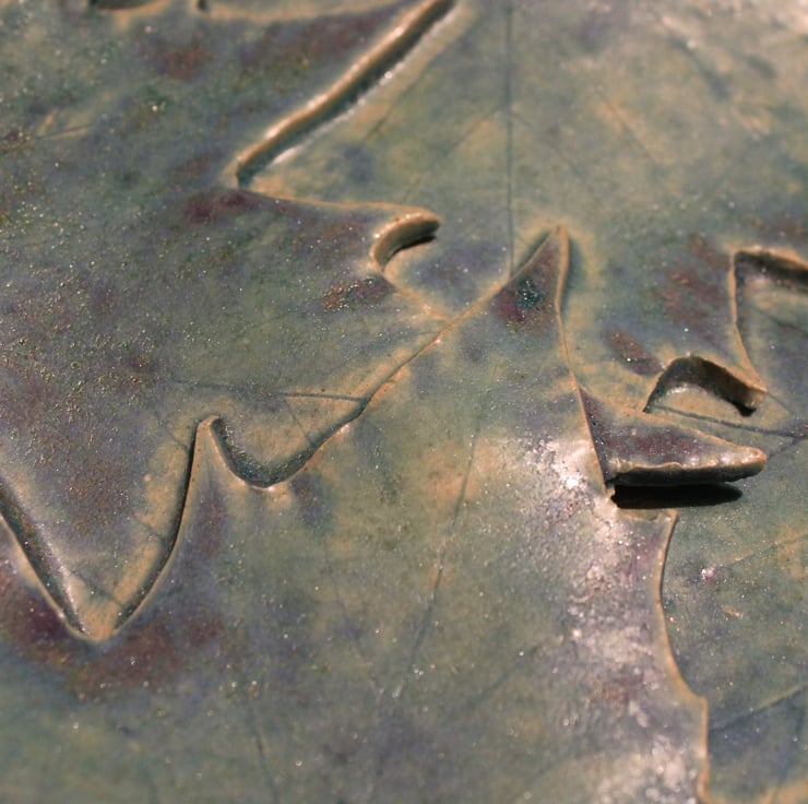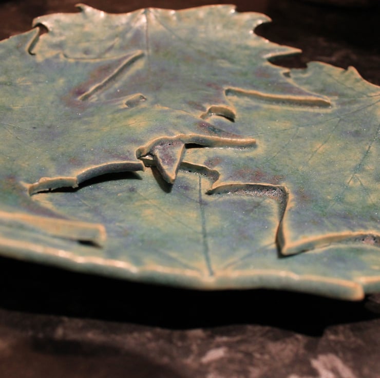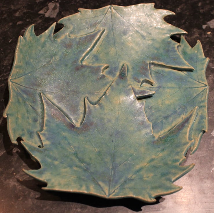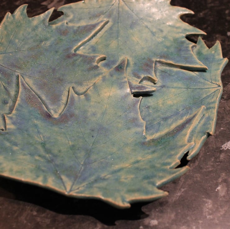 Handmade ceramic leaf dish decoration, leaves have been impressed into the surface of slab of stoneware clay, fired twice & glazed with Matt turquoise blue glaze.