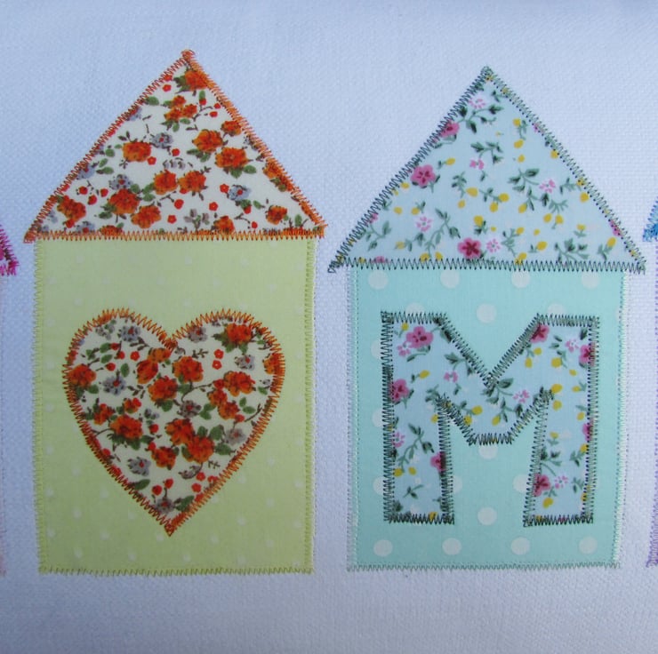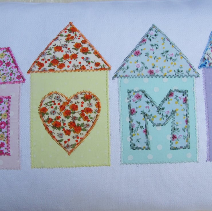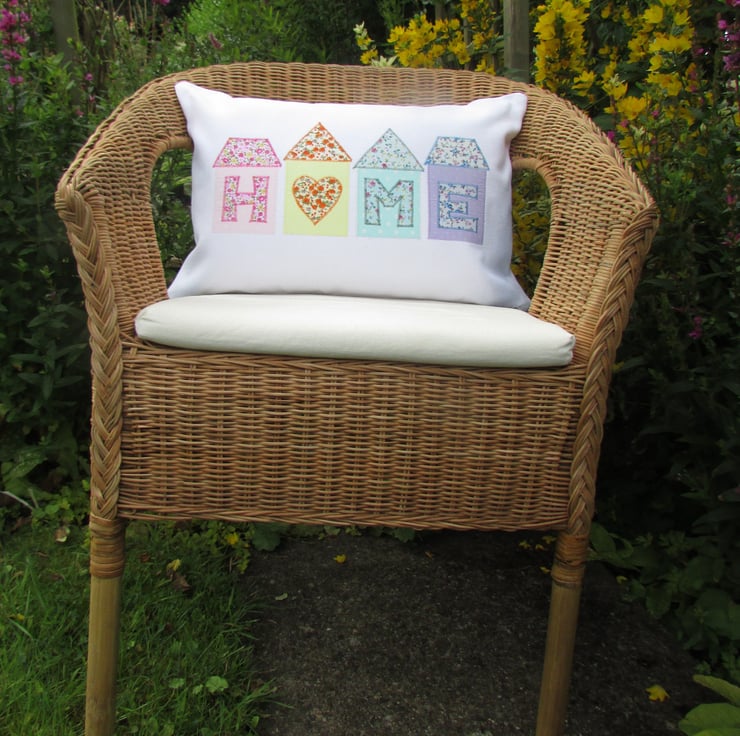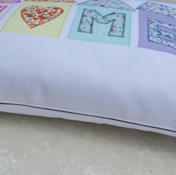 An ivory cushion with four applique houses, each with an applique letter to spell HOME. The houses are made from pastel coloured fabrics with white polka dots, one each of pink, lemon, aqua and lilac. The roofs and letters are all made from pretty, ditsy floral print fabrics to co-ordinate with the polka dot fabrics. Each applique is finished with a small machined zigzag stitch in co-ordinating colours of machine embroidery thread. The overall effect is a shabby chic style cushion in pretty pastel shades of pink, lemon, aqua, lilac, blue, orange, green and cream.