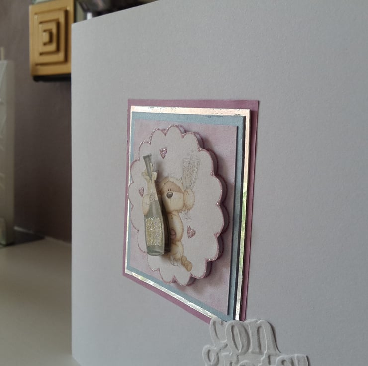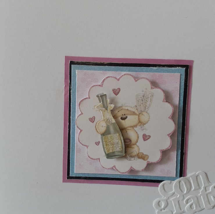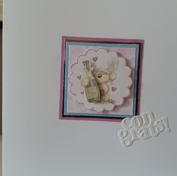 A completely handmade and uniquely designed card. Consisting of a cute teddy with celebratory bottle of champagne decoupage , mounted onto pale blue pearl, silver Morris and pink card and then onto quality pristine white card. Finished off with congrats embossed onto white card