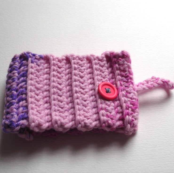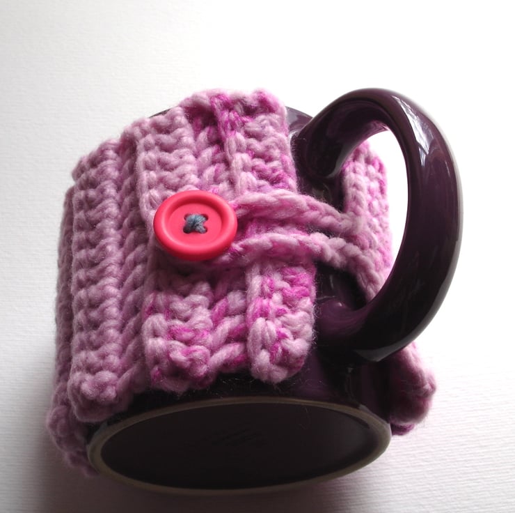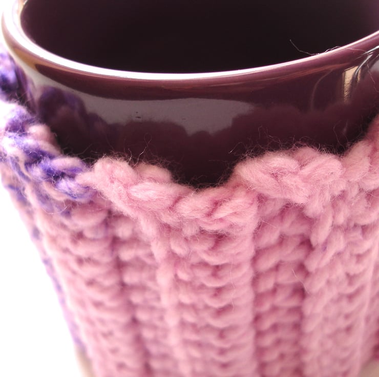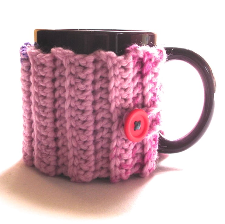 This chunky pink purple crochet mug hug is a lovely handcrafted crochet cover, perfect for wrapping around your favourite tea or coffee cup. Made to fit a standard size mug of 8cm diameter and 9cm tall. It is made using a fantastic rib pattern in this lovely multi tone pink and purple yarn. If is finished off with a cute pink button fastening.
