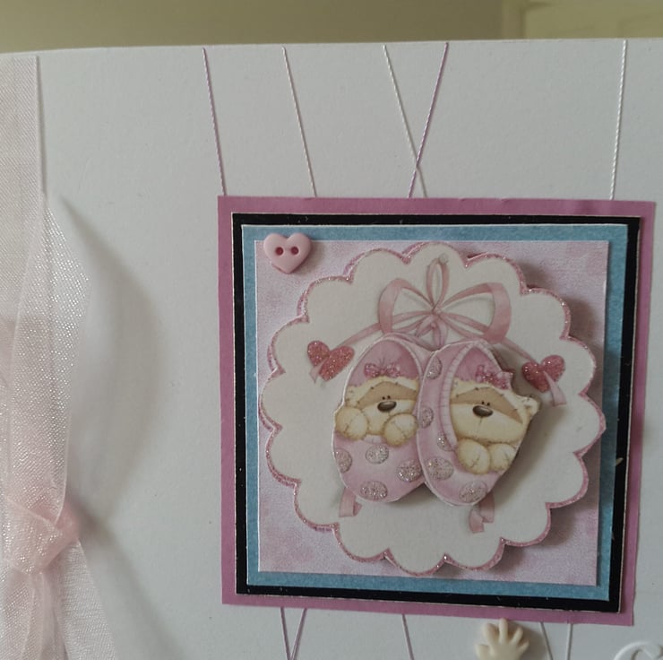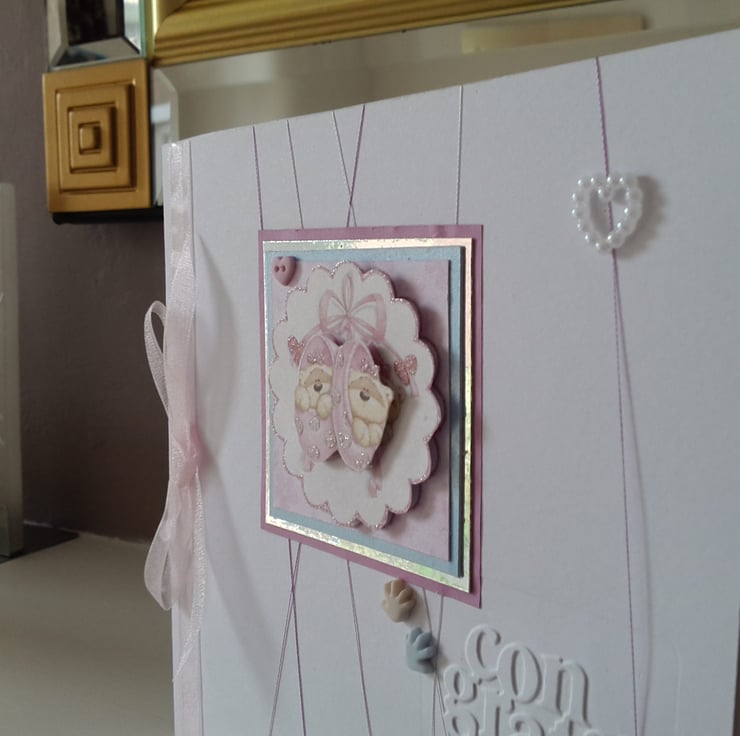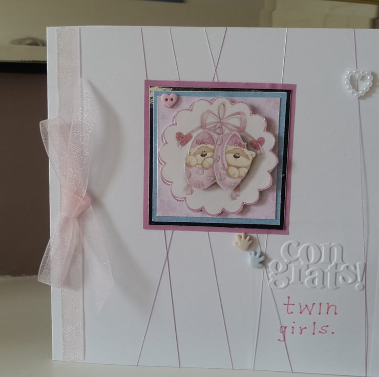 A completely handmade and uniquely designed card. Consisting of two tiny blotters filled with tiny teddies decoupage mounted onto pale blue pearl, silver Morris then pink card and then onto pristine white quality card which has had pink/silver fine thread wrapped around. Finished off with pearl heart, tiny hands, congrats embossing, twin girls handwritten and a pale pink or ribbon and how.