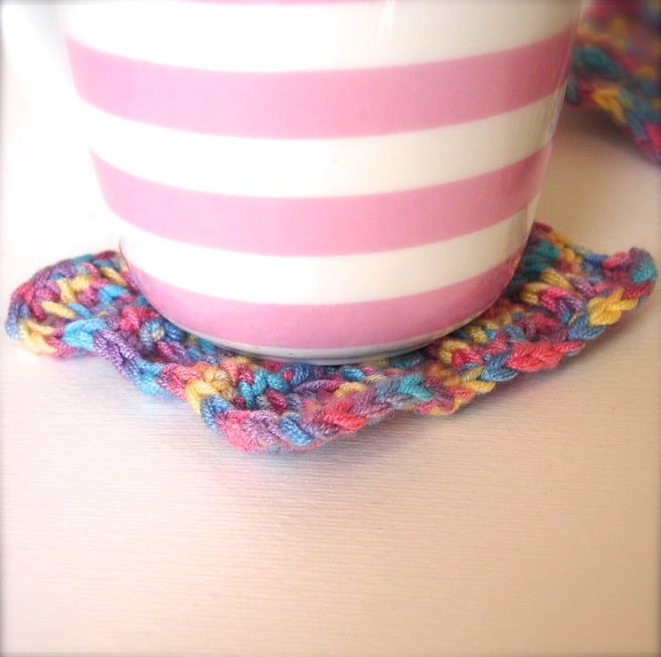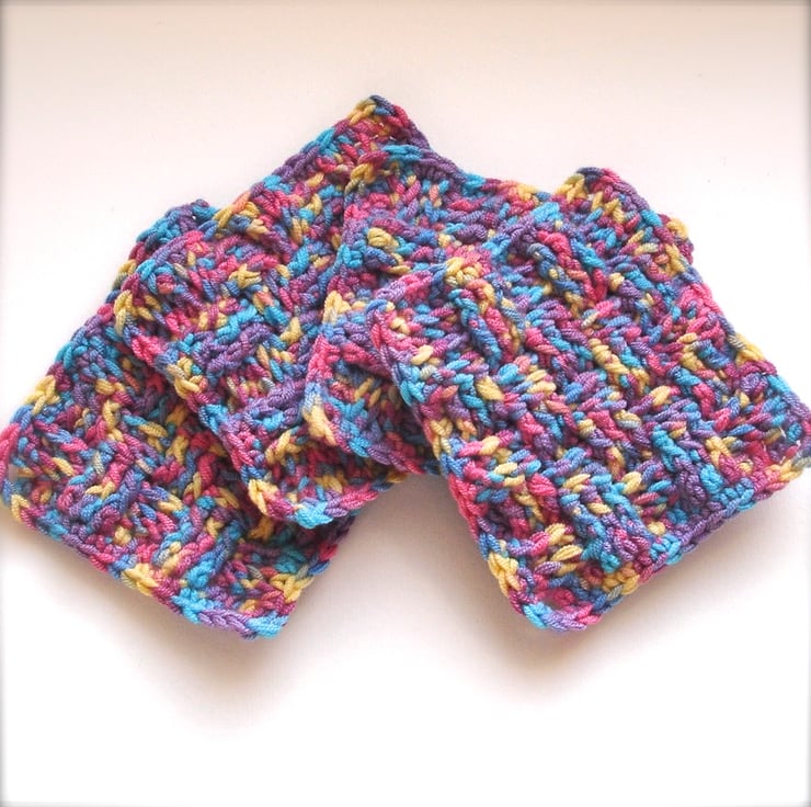 This sweet set of 4 basket weave pattern crochet coasters has been crocheted by hand. They are great to sit under any mug, fab for a home decor gift, for a house warming present or just to brighten someones day. The rainbow yarn makes them bright and cheery. These coasters are hand crocheted to a very high standard.