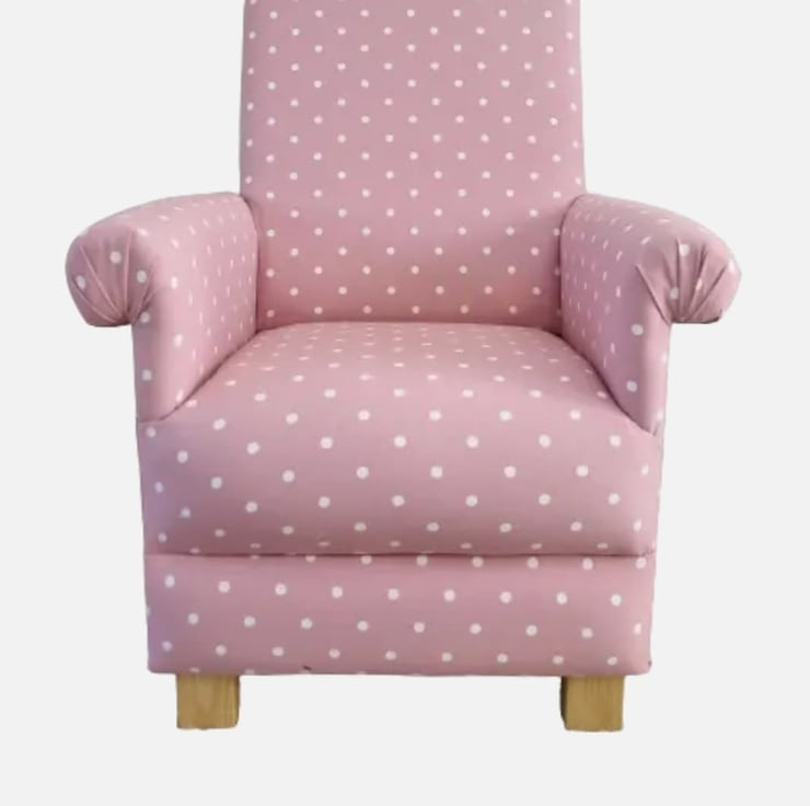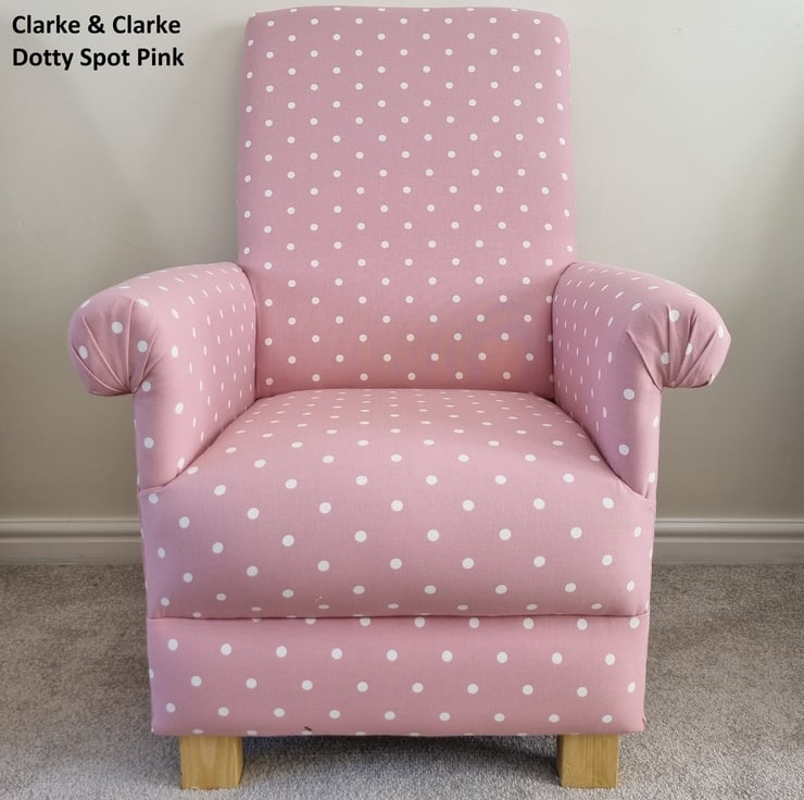 I am offering for sale this gorgeous ADULT'S chair, which has been made myself. I am a professional upholsterer with over 33 year’s experience, and have made this sturdy little chair using Clarke & Clarke Pink Dotty Spot fabric.