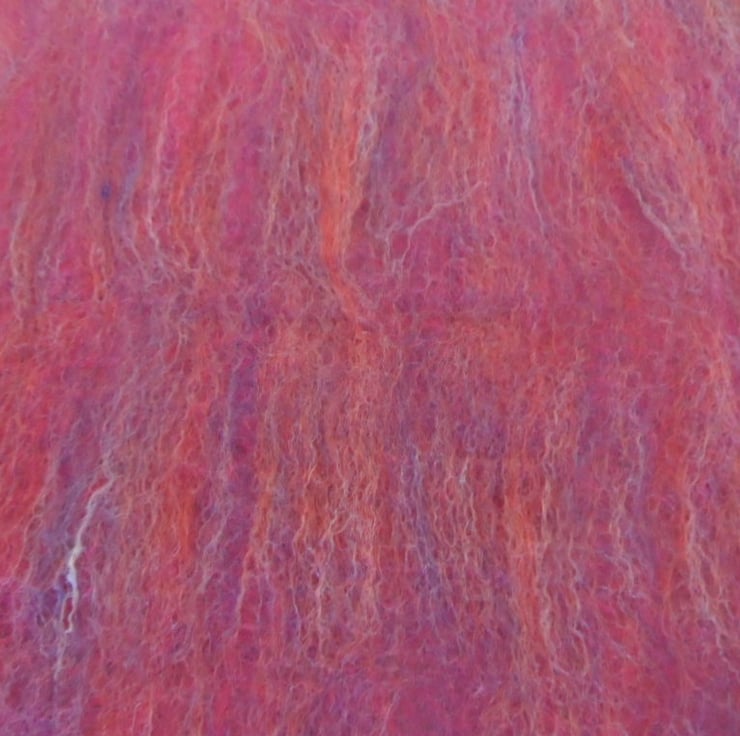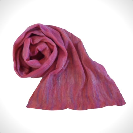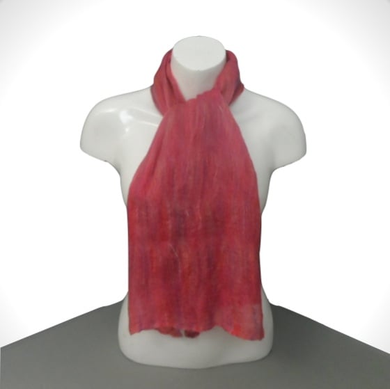 Very fine layers of super soft merino wool in a blend of pinks and purples have been nuno felted to both sides of a pink silk chiffon base material to produce this scarf. The nuno felting process causes the woollen fibres to migrate through the silk and bind with it. The scarf measures approximately 130cm x 40cm (51" x 16") and has been designed to drape around the neck or shoulders as an accessory rather than as a wrap around scarf. However, the use of all natural materials (wool and silk) means that this scarf will provide additional warmth in winter while remaining cool in summer.