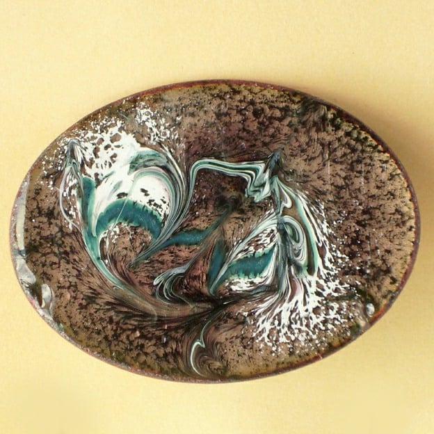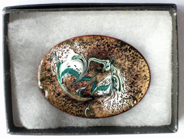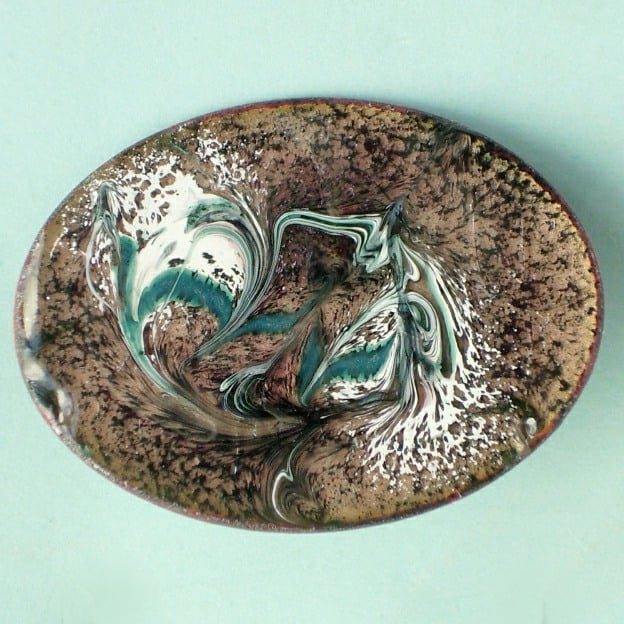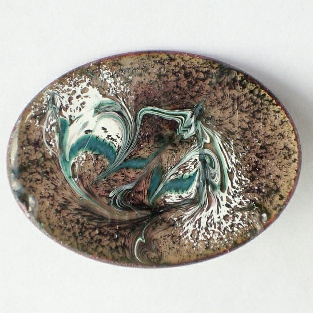 I have made this brooch by scrolling a random pattern of white and dark green over a base of black enamel. The black is over a base coat of clear enamel allowing the copper base to show through, golden brown. I have counter enamelled the copper base on which the enamel is laid.