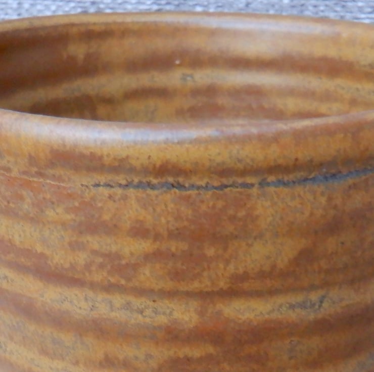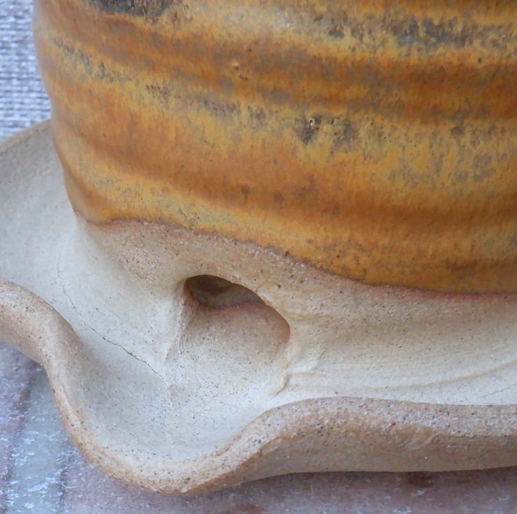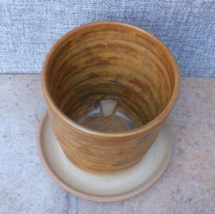 Thrown on my pottery wheel using strong toasted stoneware clay, and I have finished it in a lovely mottled ochre reactive glaze.
