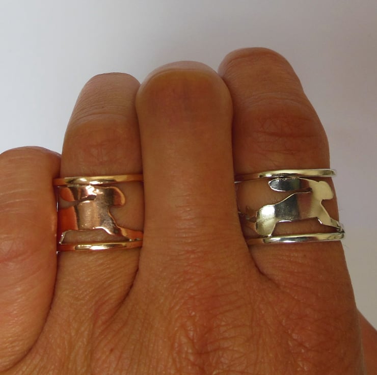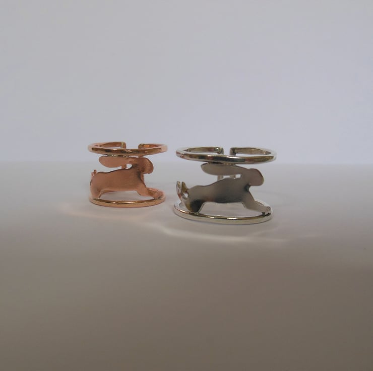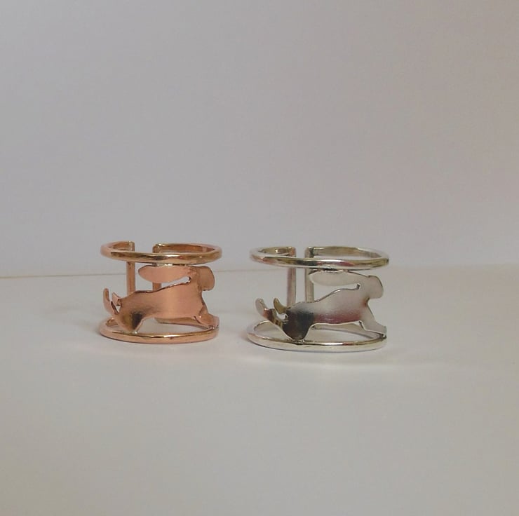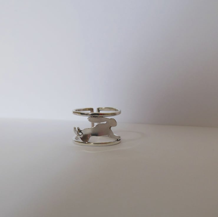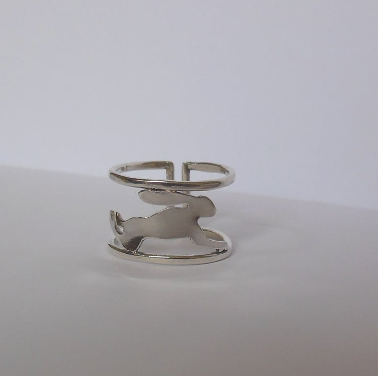 This ring is formed entirely by hand using a range of traditional techniques. It is composed of wire and a Leaping Hare pierced out of sheet , all materials are Sterling silver .