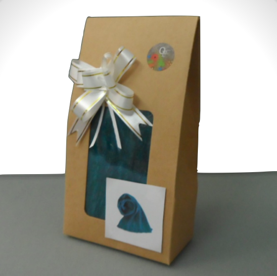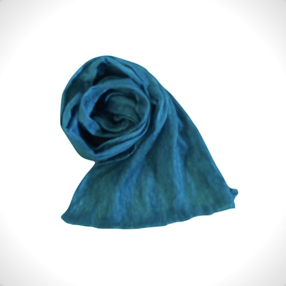 The scarf is a dress length scarf designed to be draped around the neck rather than encircling it although the presence of the wool and silk will provide additional warmth in the winter but will remain cool in summer. It measures approximately 130cm x 40cm ( 51" x 16").