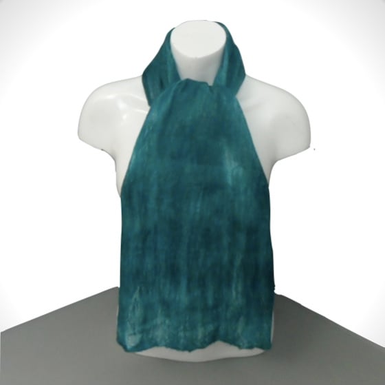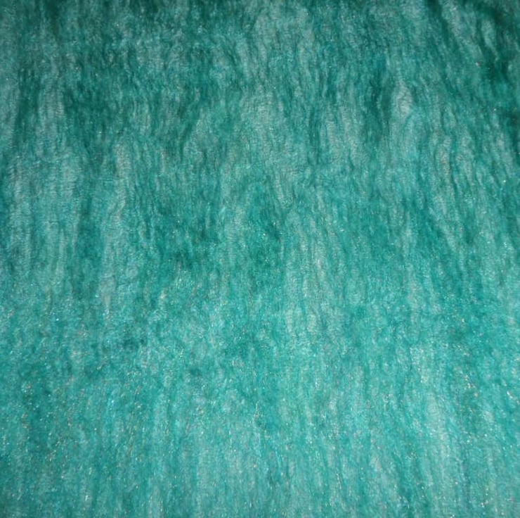 This scarf has been nuno felted using very fine layers of a blend of sea green merino wool and rainbow strands of trilobal nylon on a blue silk chiffon base material. The resulting scarf is amazingly soft and lightweight. The addition of the nylon strands gives the scarf a glitzy effect when light catches it which is difficult to illustrate in photographs but is just about visible in the 4th photograph. The scarf has been felted on both sides.