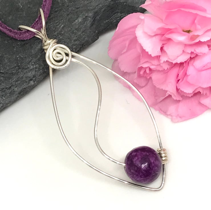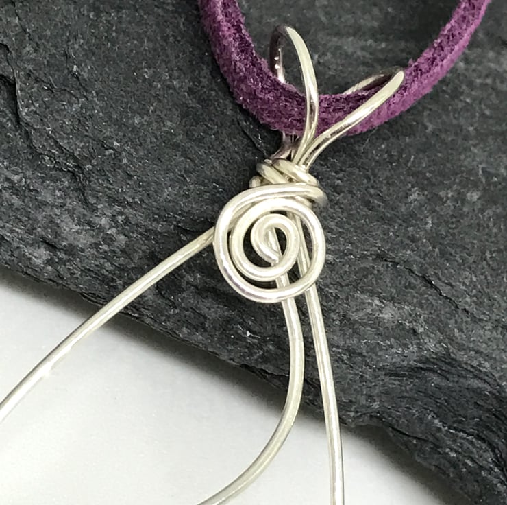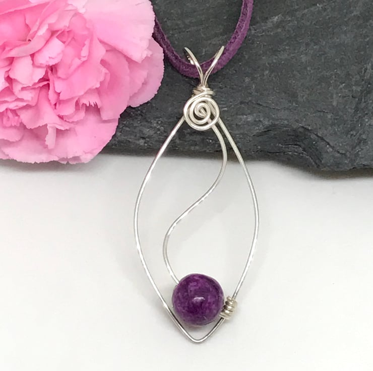 I have created this elegant pendant with sterling silver wire. I have formed an oval shape and added a curved feature incorporating a beautiful purple jasper bead. The pendant has an open bail with swirl detail. The pendant hangs from a purple suede cord with sterling silver cord ends and a handcrafted sterling silver hooked clasp.
