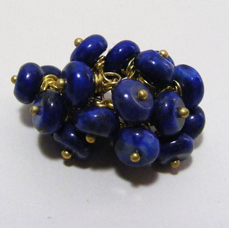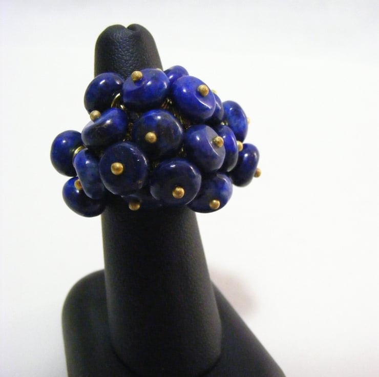 I have made this lovely semi precious gemstone ring by threading 8 x 5 mm lapis rondelles onto gold plated ball headpins and wrapping them onto a 10 loop gold plated adjustable ring.