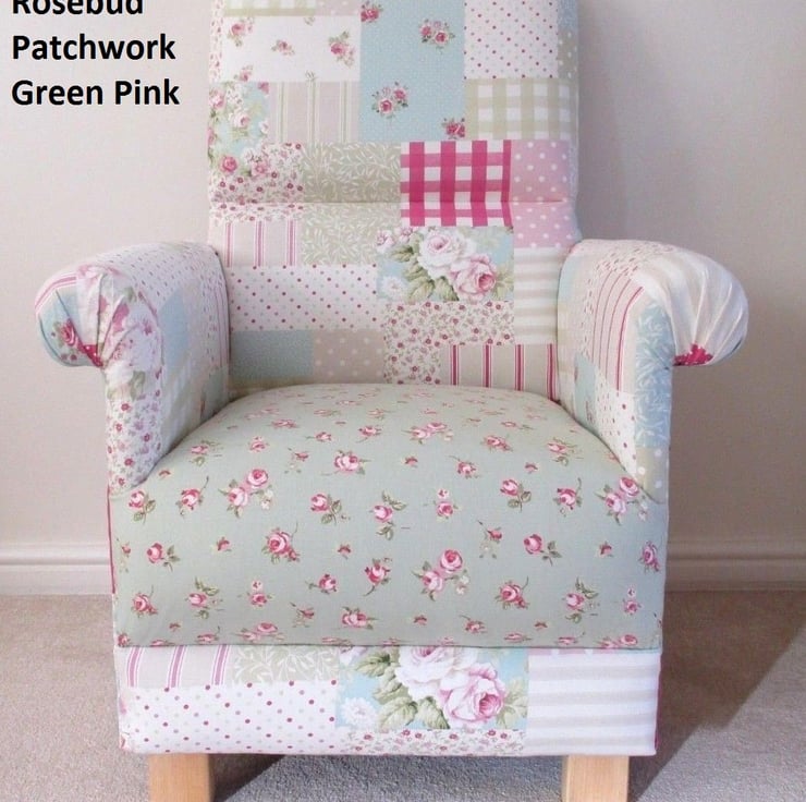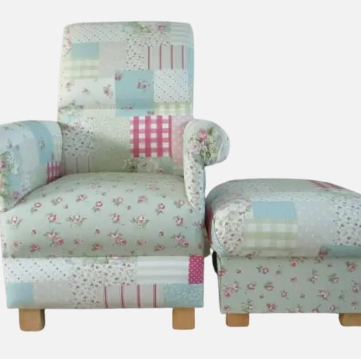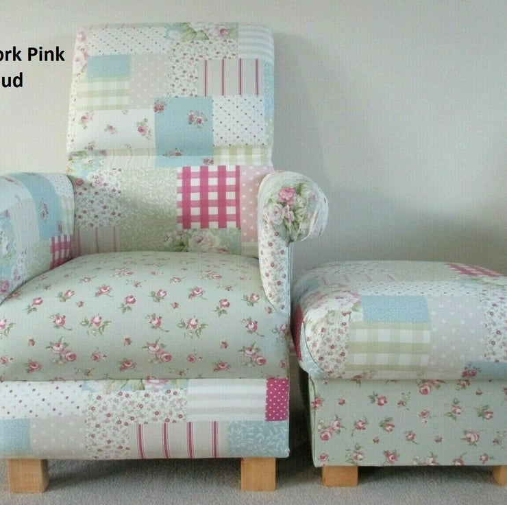 I am offering for sale this gorgeous ADULT'S chair, which has been made myself. I am a professional upholsterer with over 33 year’s experience, and have made this sturdy little chair and matching footstool, using Clarke & Fryetts Patchwork fabrics.