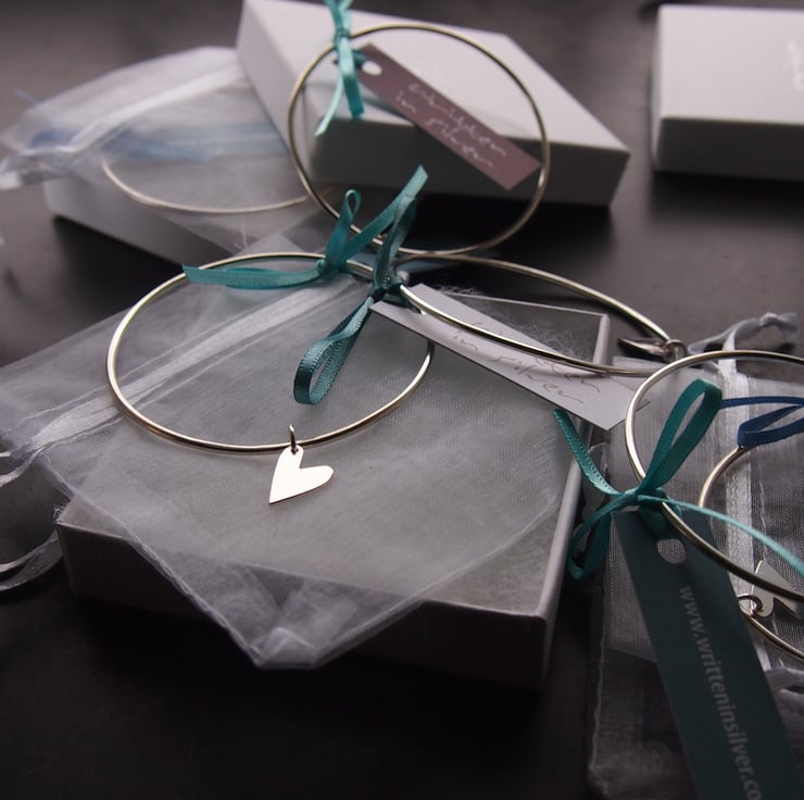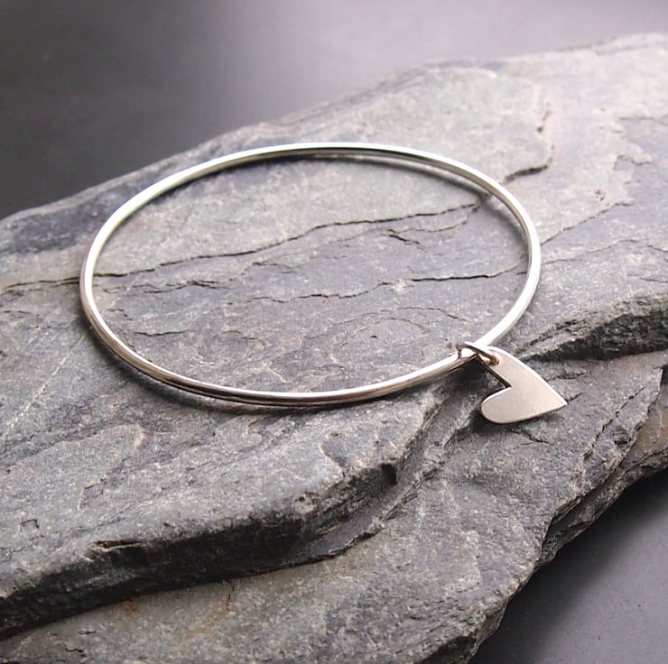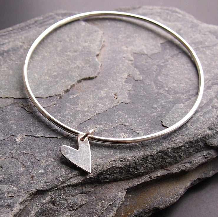 A perfectly plain 2mm bangle, hammered texture and with a hand pierced heart charm all in sterling silver
