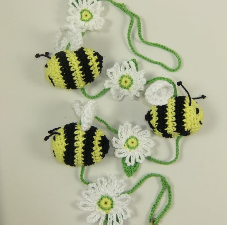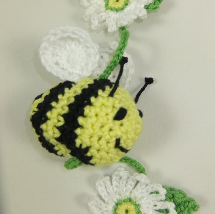 A pretty hanger featuring three crocheted bees interspersed with cheerful daisies!