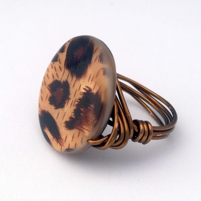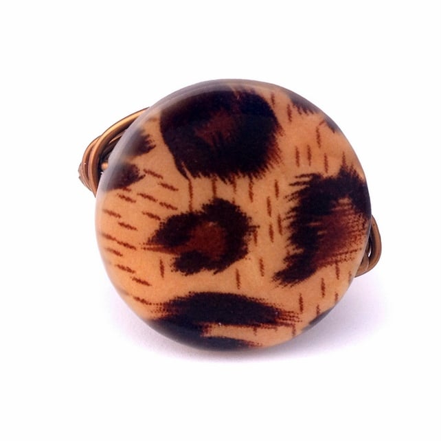 This statement wire wrapped ring features a 20mm brown shell coin. The coin has an animal print pattern on it, but you can still see shine of the shell through the pattern that looks lovely as it catches the light.