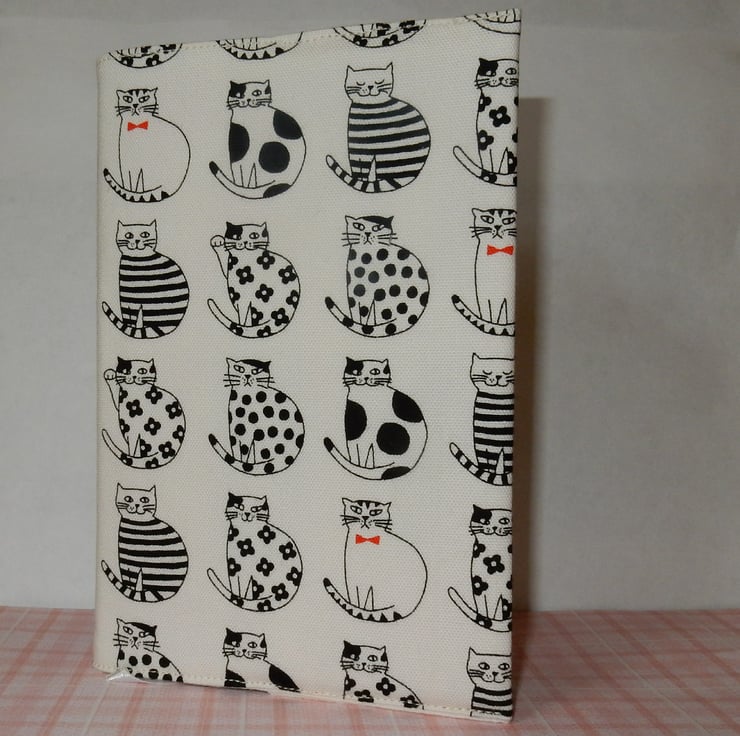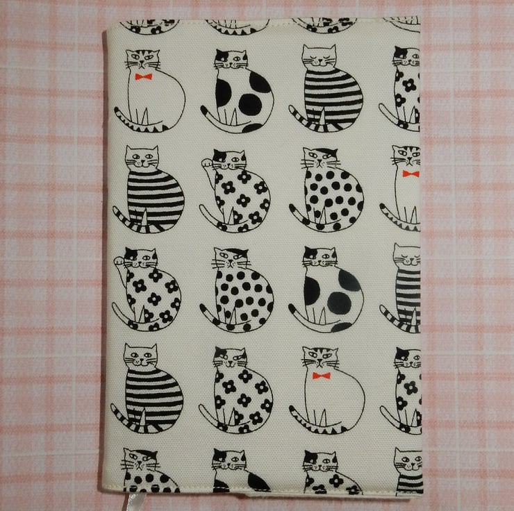 This is for cat lovers, a fun A6 (approx. 6x4 inches) week to view fabric covered diary. It is covered in a fabric featuring black and white cats on a white background. Complete with standard 2017 week to view diary, refills are easily available, for the next year. The cover is lined, interfaced and removable, and the dairy also has pages for notes.