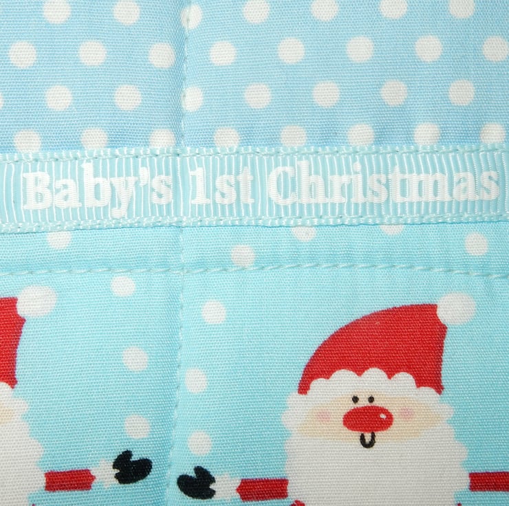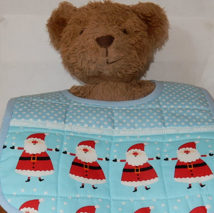 This baby bib is made from two cotton fabrics, one featuring Father Christmas, and the other a toning spot print. The bib has a cotton mix wadding, and a flanelette backing for softness and absorbency and is fully washable. There is a ribbon reading "Baby's 1st Christmas". It has a velcro fastening, and is bound in a blue binding.
