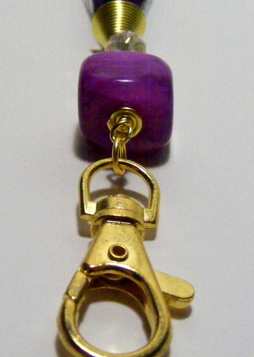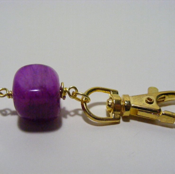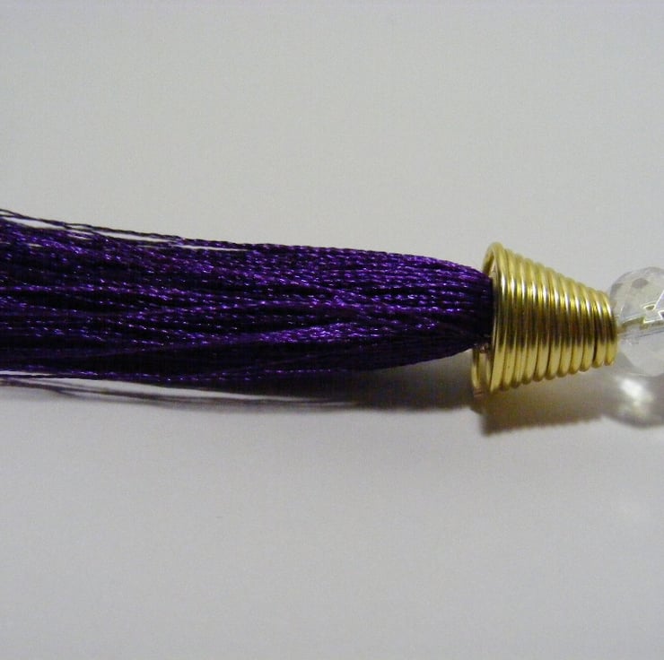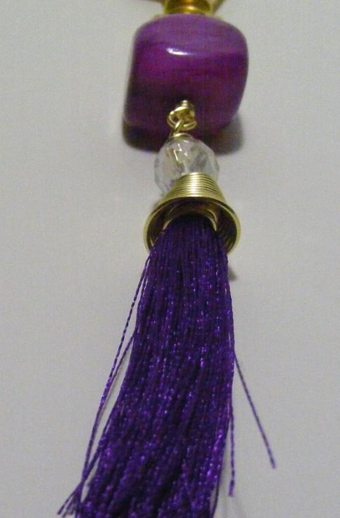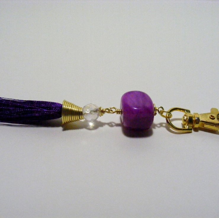 I have made this bag charm with a 15 mm purple agate cube bead which is wire wrapped with gold plated wire. 8 mm mystic white quartz faceted round bead is also wrapped and linked to the agate cube. Purple cotton tassel and gold plated cone are handmade and attached to the quartz bead. Swivel clip is gold plated.
