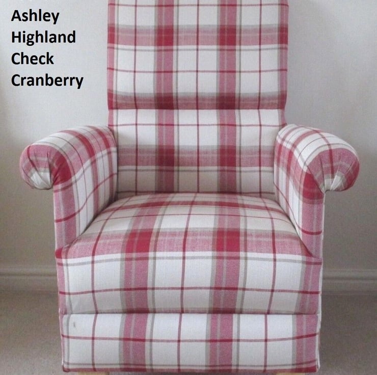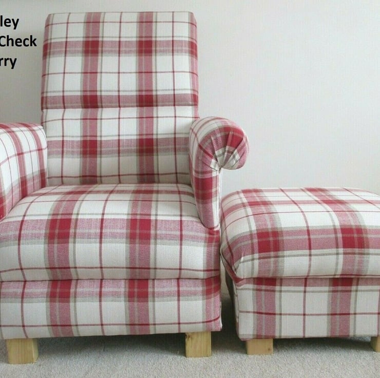 I am offering for sale this gorgeous ADULT'S chair, which has been made myself. I am a professional upholsterer with over 33 years experience, and have made this sturdy little chair and matching footstool, using Laura Ashley Highland Check Cranberry Red fabric.
