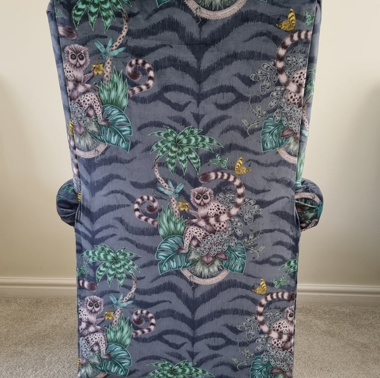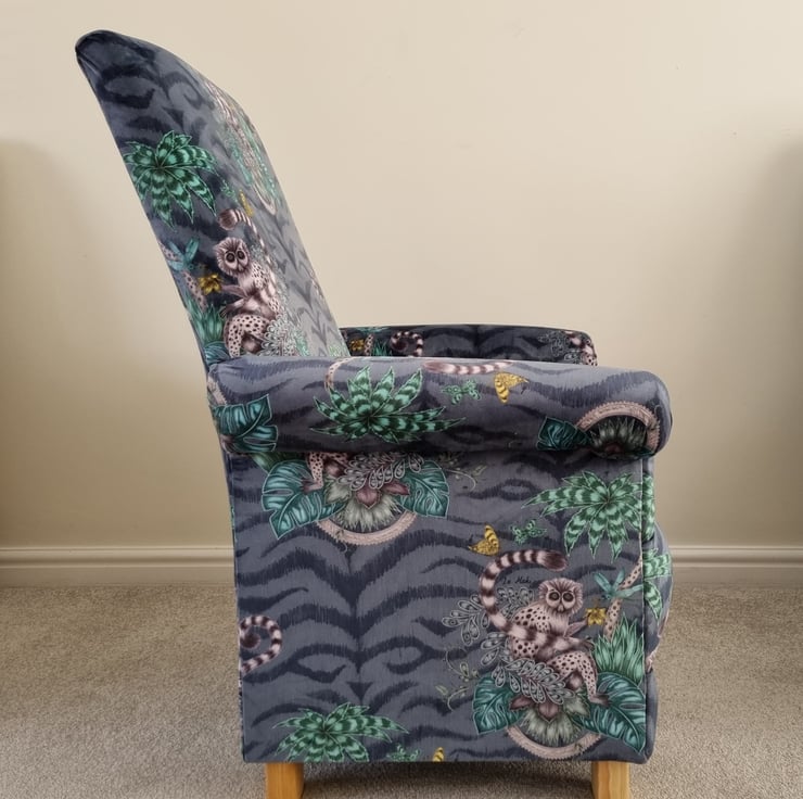 This lovely adult's armchair measures approximately 38 inches in height, by 26 inches wide and will look gorgeous in any room, and is a real accent piece of furniture. It has a wooden frame and has a fire retardant interliner, which makes it compliant with UK fire regulations. It is then upholstered entirely with this gorgeous fabric, and has solid wooden feet.