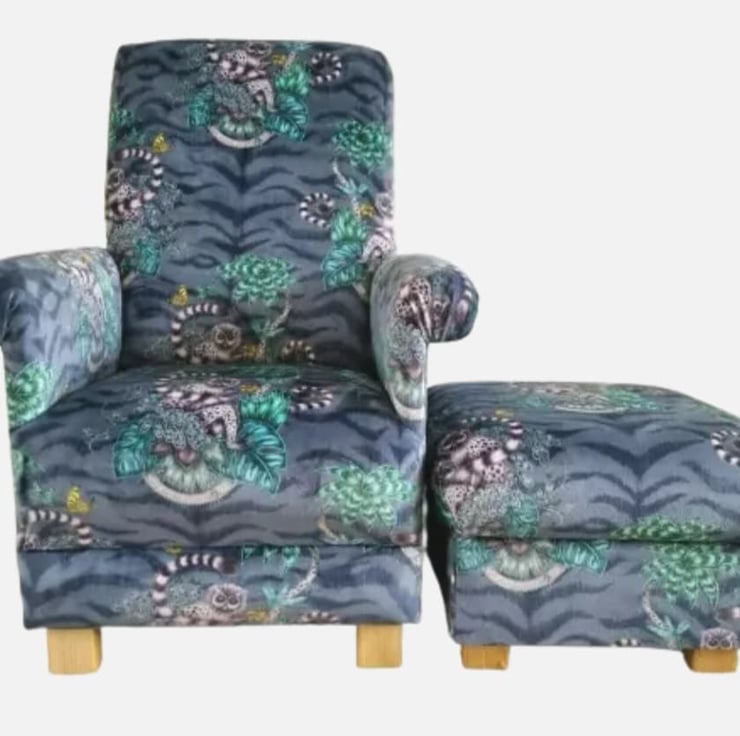 Emma J Shipley Lemur Navy Velvet Fabric Chair & Footstool Adult Armchair Monkeys