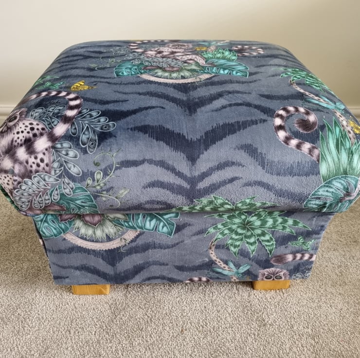 I am offering for sale this gorgeous ADULT'S chair, which has been made myself. I am a professional upholsterer with over 33 years experience, and have made this sturdy little chair and matching footstool, using Emma J Shipley Lemur Navy Velvet fabric.