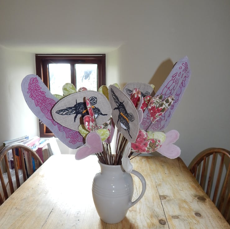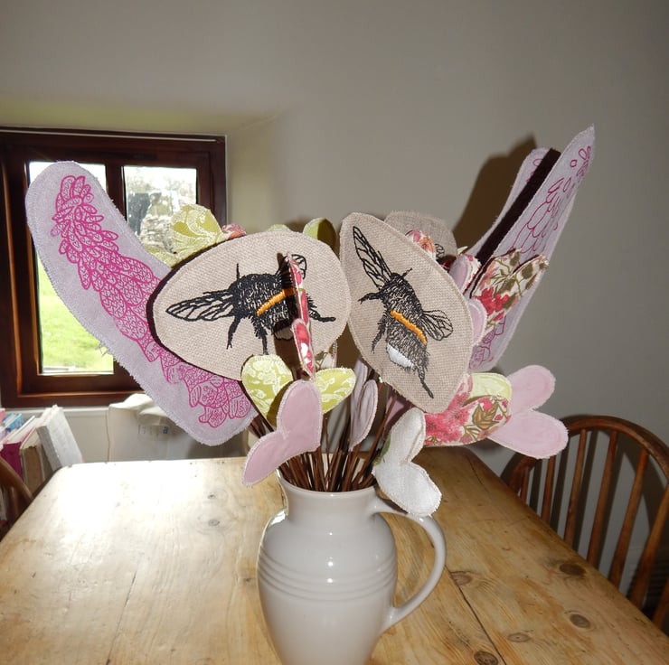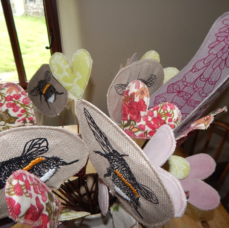 Lovely 4 screen printed bees with hand embroidered yellow and white banding. The length of willow from bottom to top of hare measures 18 inches or less in length. The bee measures roughly 4 inches by 4 inches. There are also 4 magenta pink screen printed foxglove heads. There are over 20 hearts in liberty soft cotton and pink velvet. These are all glued onto sticks of willow.