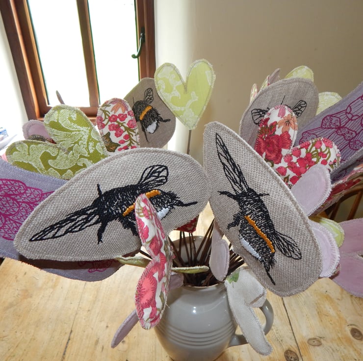 All fabric bees and hearts are double sided and are straight and zig-zag stitched to stop fraying. There are two layers of interfacing within each.