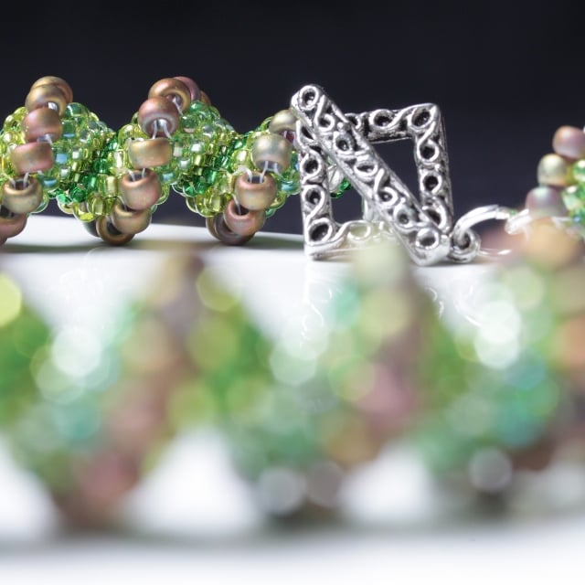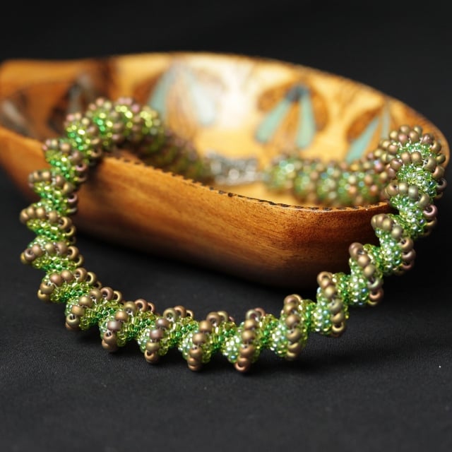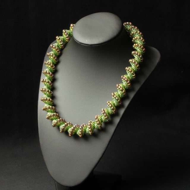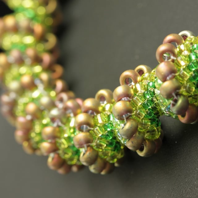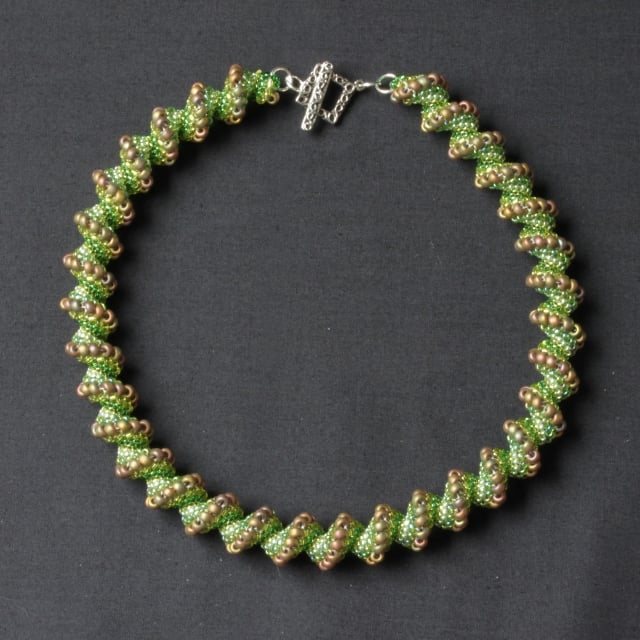 This highly textured spiral necklace is made from different sizes of beads in shades of green, lime green, pale green and khaki. The stitch is called Cellini Spiral, a modified tubular peyote stitch. The necklace is hollow, making it light in weight, despite its thickness. It is finished with a pretty pewter toggle clasp.