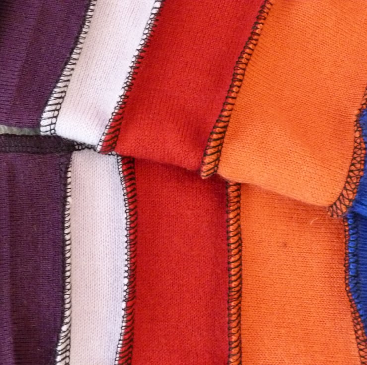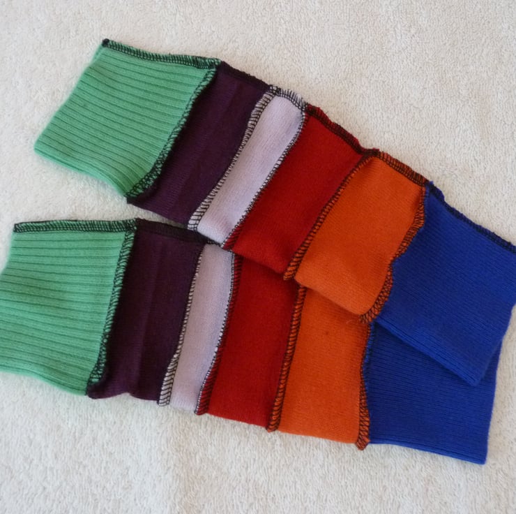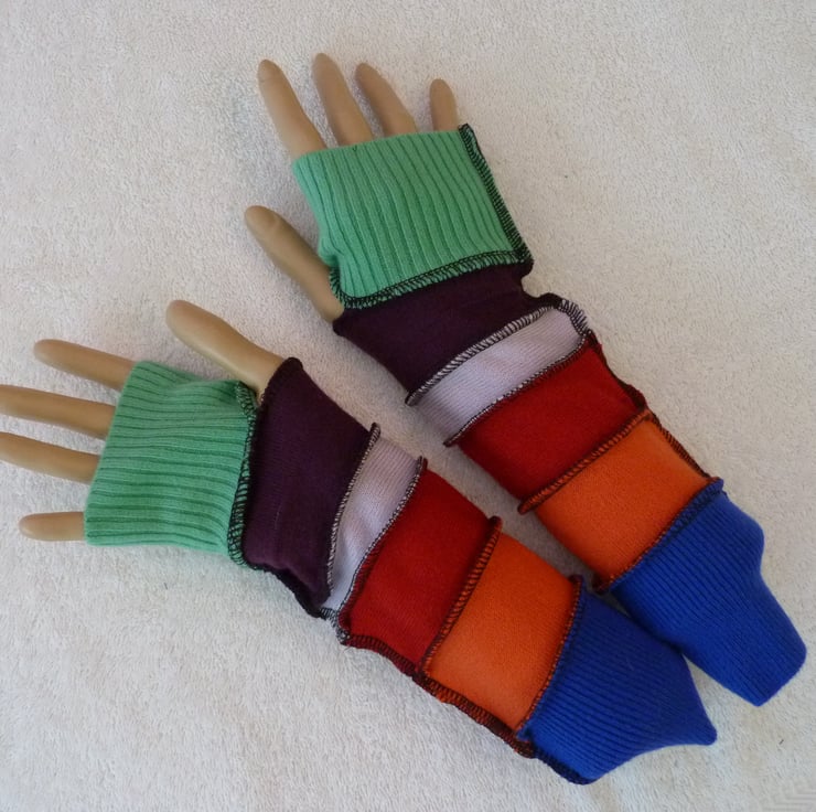 I have created these unique up-cycled arm-warmers from mixed fibre jumpers. The jumpers have been hot washed before cutting and stitching with an over-locker into warm and cosy fingerless gloves / arm-warmers, with a thumb hole.