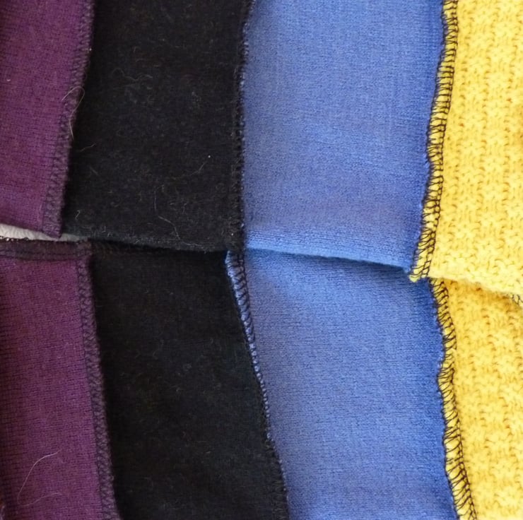 I have created these unique up-cycled arm-warmers from mixed fibre jumpers. The jumpers have been hot washed before cutting and stitching with an over-locker into warm and cosy fingerless gloves / arm-warmers, with a thumb hole.