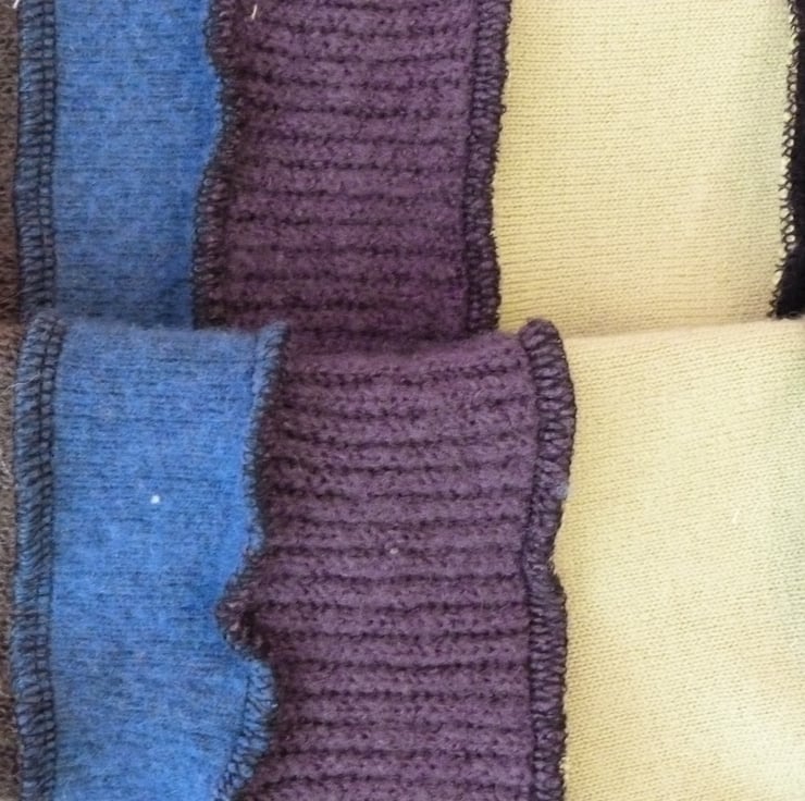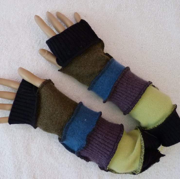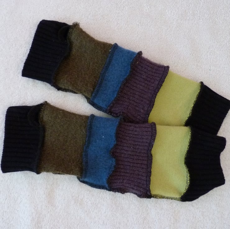 I have created these unique up-cycled arm-warmers from mixed fibre jumpers. The jumpers have been hot washed before cutting and stitching with an over-locker into warm and cosy fingerless gloves / arm-warmers, with a thumb hole.