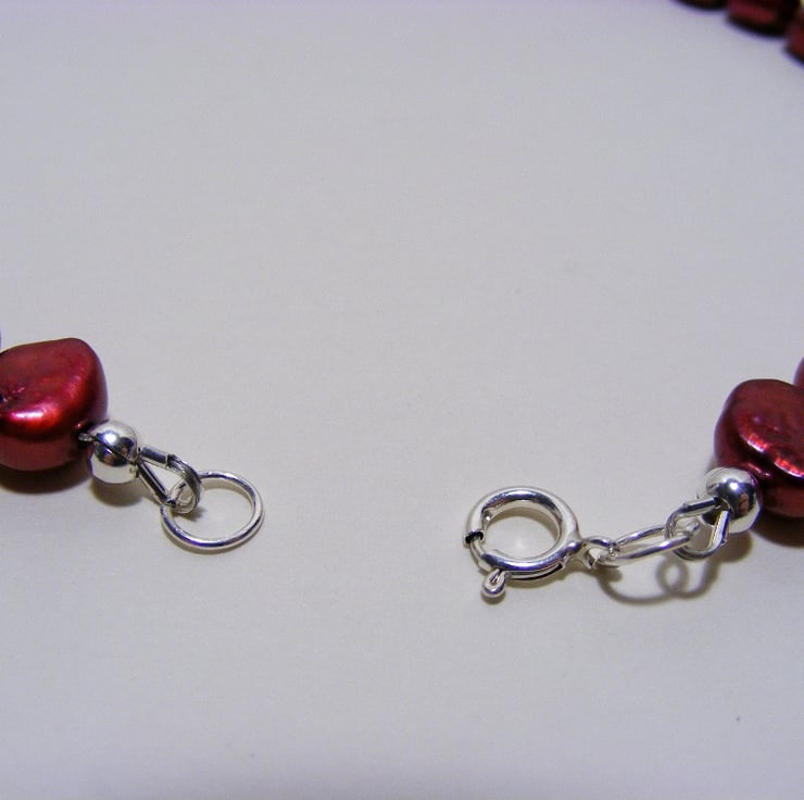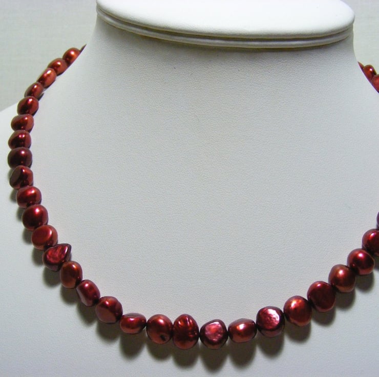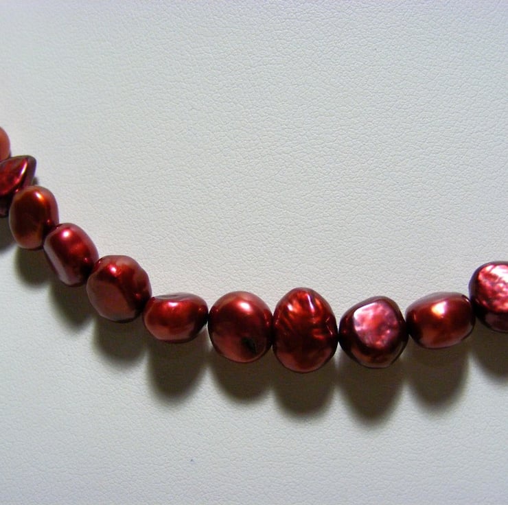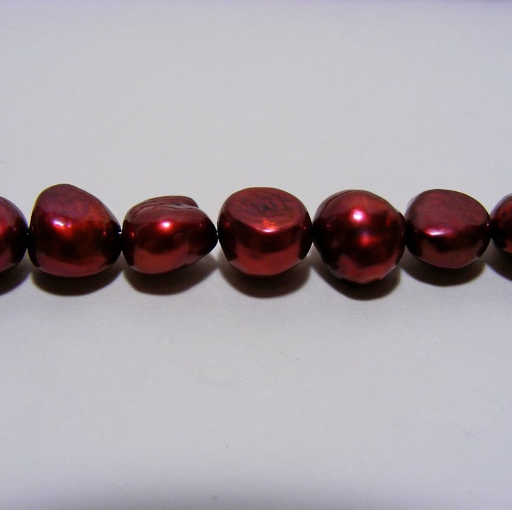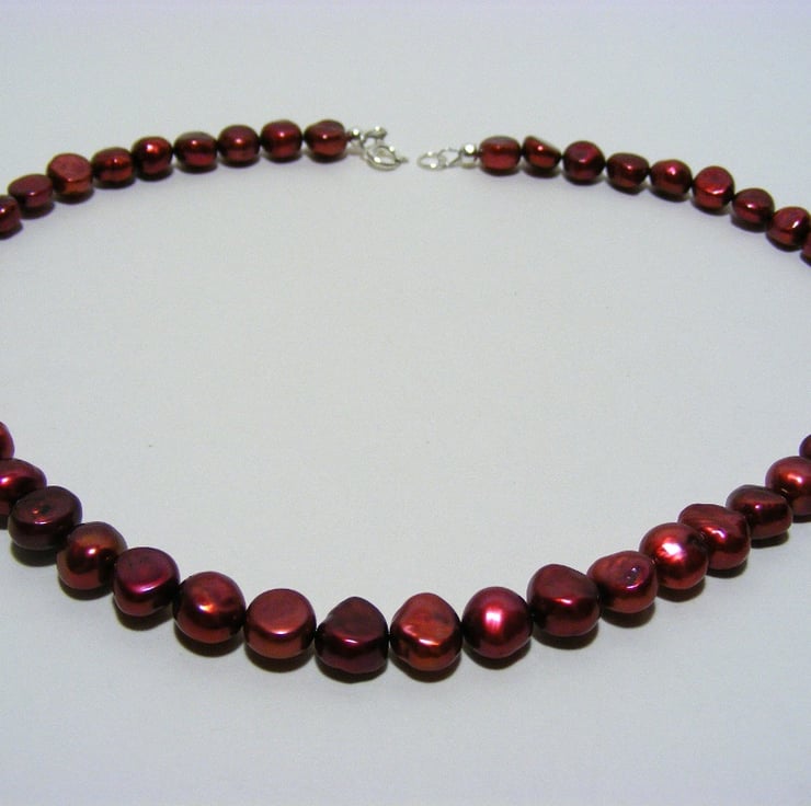 9 x 7 mm cherry baroque pearls onto silver beading thread. Ends of the thread are finished with 925 sterling silver findings, Clasp is a 925 sterling silver bolt clasp which has 925 stamped on.