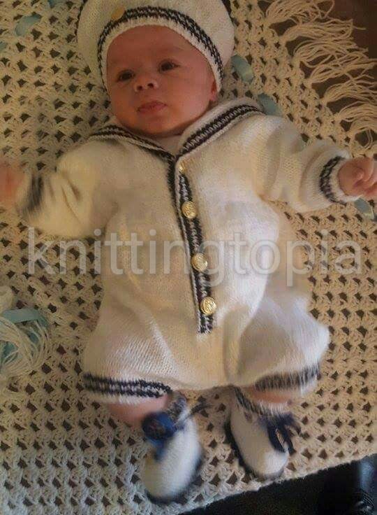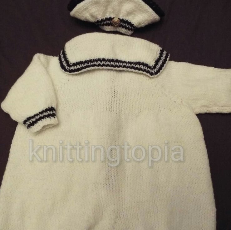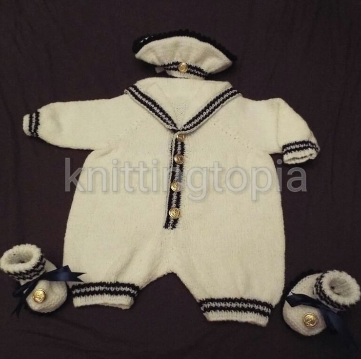 Hand knitted baby sailor romper hat and bootie set made to order 0 - 6 months made to order