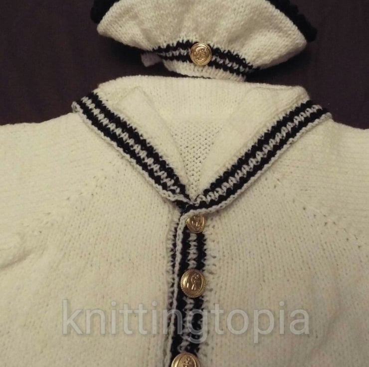 This cute little romper set is knitted in the style of a sailor outfit. Knitted in white with navy blue accents, the romper has short legs, long sleeves and a collar just like the sailors. It is finished off with gold effect anchor buttons for the true nautical look.