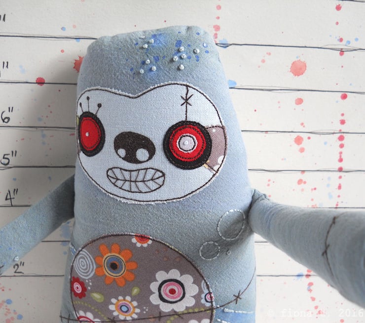 (fabric paint) goop has been spattered, and textural details picked out with hand embroidered french knots and bullion knots. her eyeballs are hand embroidered.