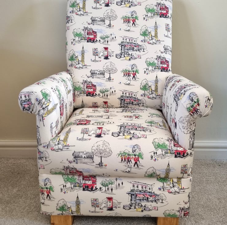 I am a professional upholsterer with over 33 years experience, and have made this sturdy little CHILD’S chair, using Cath Kidston Billie Goes to London fabric.