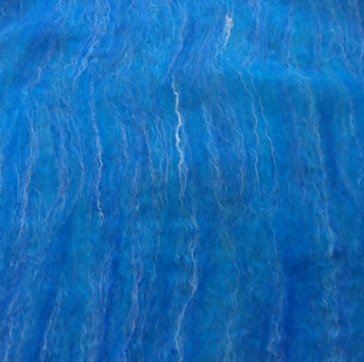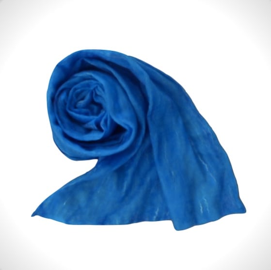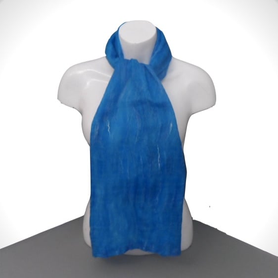 This scarf has been made using shades of blue merino wool and bleached tussah silk on a silk chiffon base fabric. Nuno felting is a process which causes the woollen fibres to migrate through the silk and bind with it creating a gorgeously soft and floaty material.
