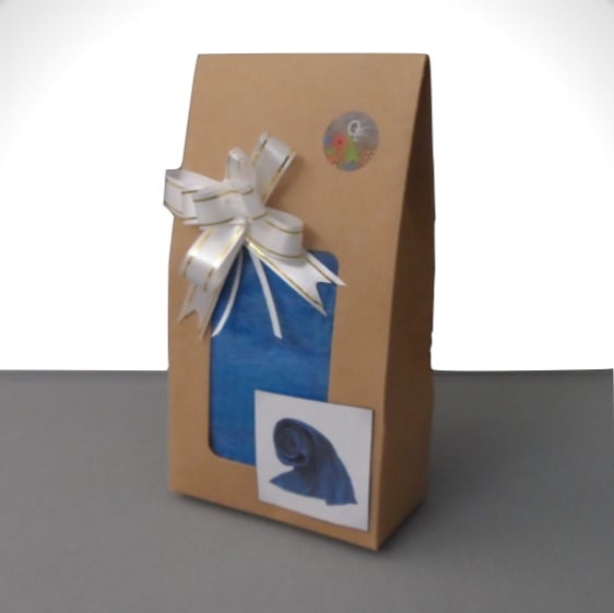The scarf is a dress length scarf designed to be draped around the neck. Made from all natural fibres (wool and silk) allows it to provide warmth in the winter while remaining cool in summer.