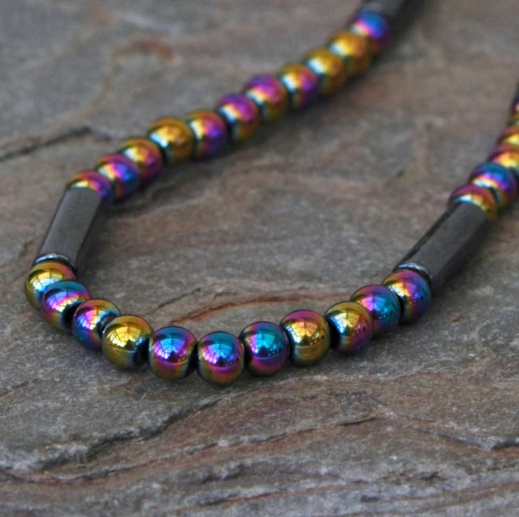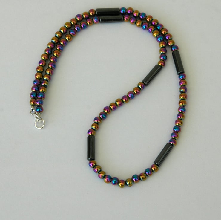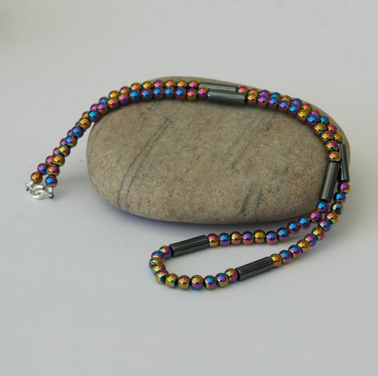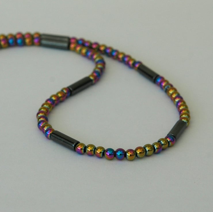 This stunning gemstone necklace features round beads of semi-precious haematite which have been electroplated with a metallic finish that reflects all the colours of the rainbow! It's a statement piece that could be worn with almost anything. The beads are 4mm in diameter and are interspersed with dark gunmetal grey haematite tube beads measuring 4x13mm. The necklace is 44cm, 171/2 inches long and fastened with a sterling silver bolt and ring clasp stamped 925. A pair of matching earrings is available - see last photo.
