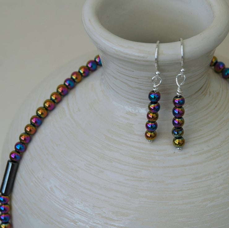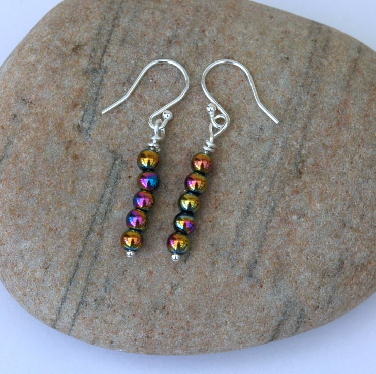 These gorgeous sterling silver and gemstone earrings feature 4mm round beads of semi-precious haematite which have been electroplated with a metallic finish that reflects all the colours of the rainbow. The earrings have a drop of 2.5cm, 1 inch below the hook. The beads are mounted on handmade sterling silver head pins and suspended from elegant beaded ear hooks, stamped 925 for sterling. A matching necklace is available - see last 3 photos. The two can be purchased together at a discount price in the Jewellery Sets section of my Folksy shop.
