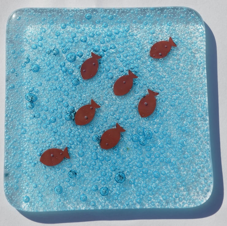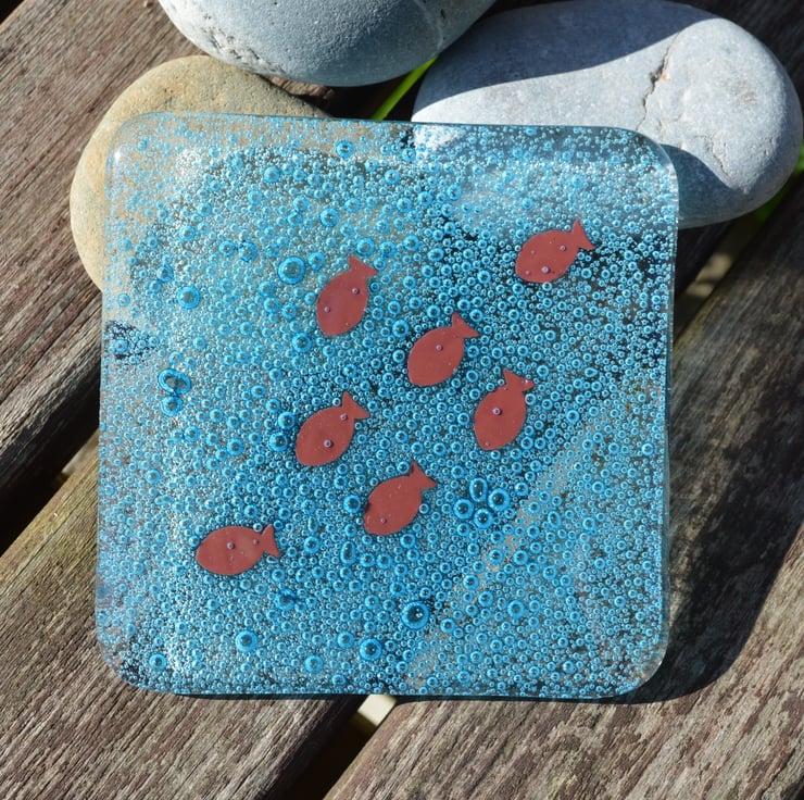 Bespoke bubbly copper fish coaster measuring approx.10cm (4 inches) square. Made from layers of clear glass fused together with bubble and copper fish inclusions. Bottom has small rubber stopper feet to protect your furniture.