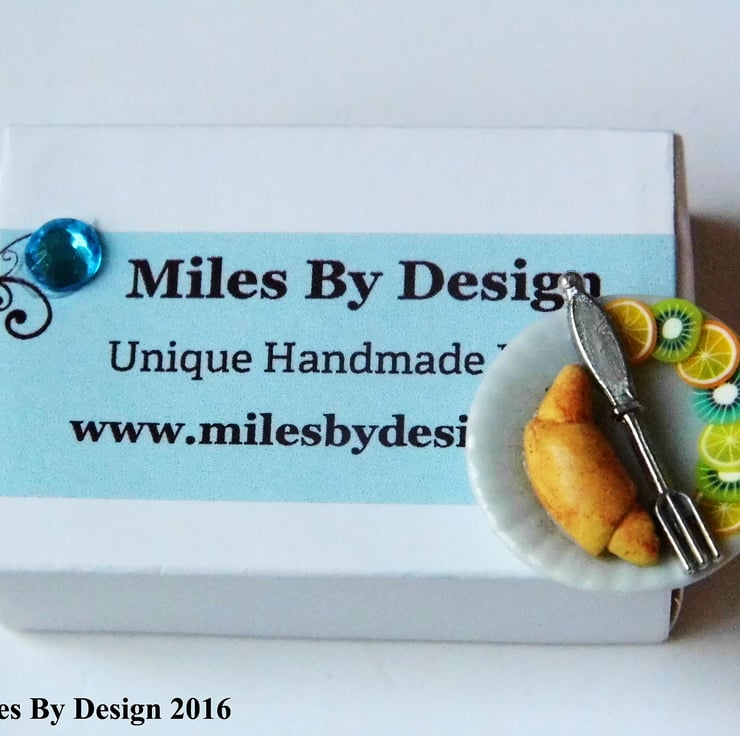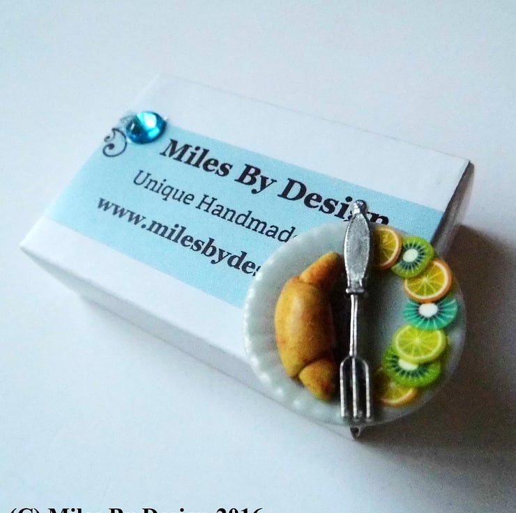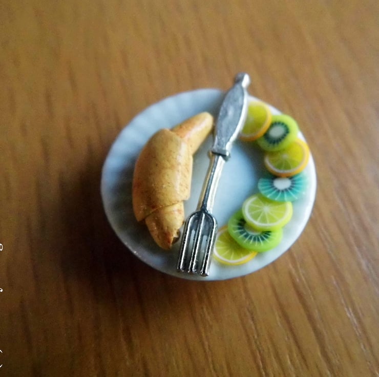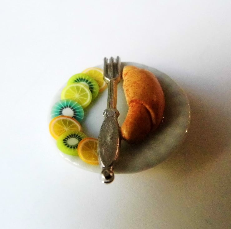 The croissant is handcrafted from polymer clay and the fruit from a plastic cane.
