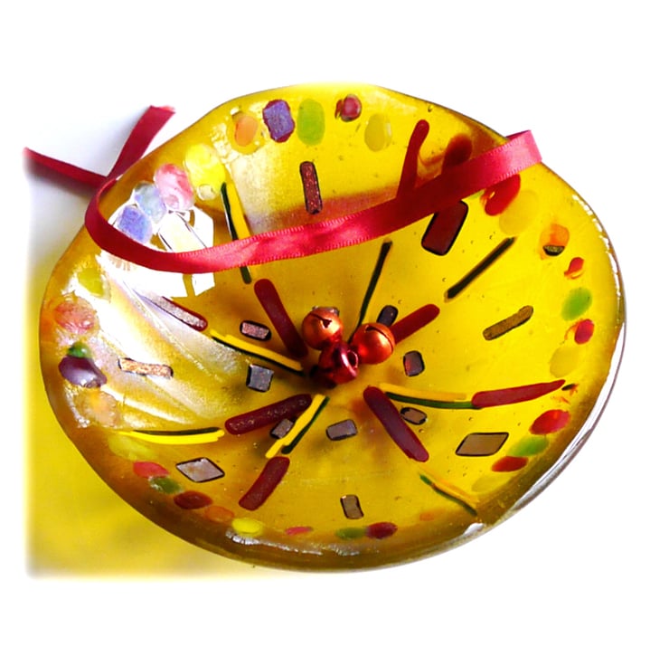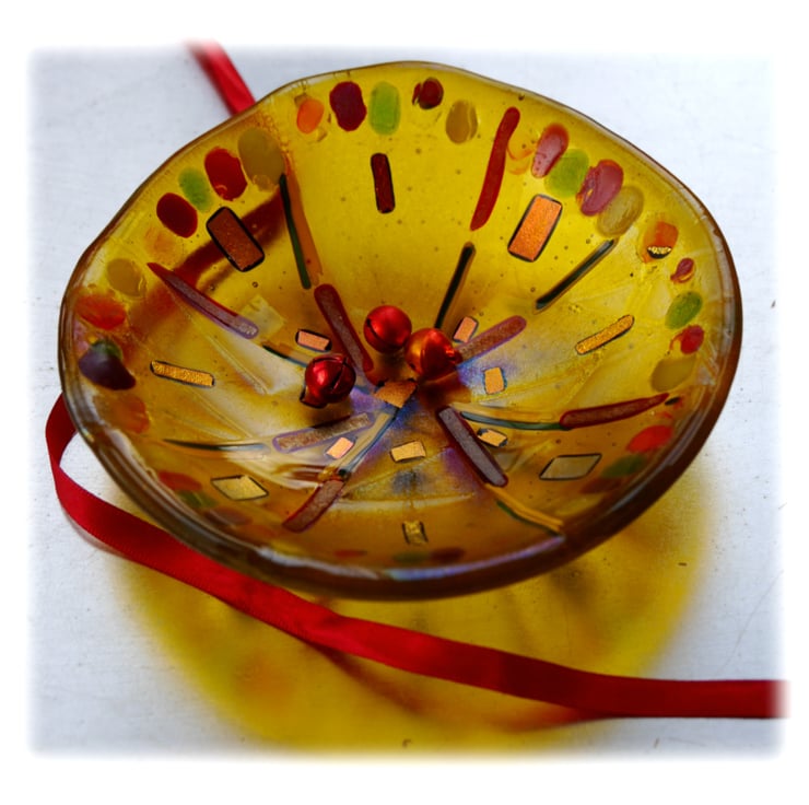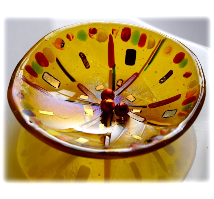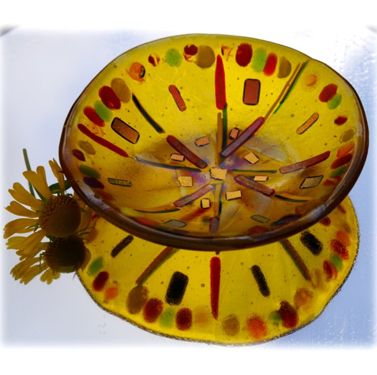 This is fused glass bowl, twice fired to very high temperatures in my kiln, first to fuse all the glass together as a flat circle, 2nd to slump it over a little mold into a dish.