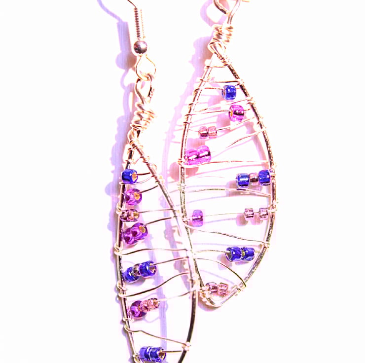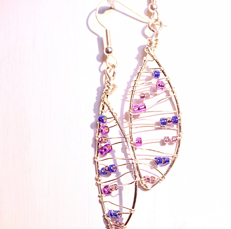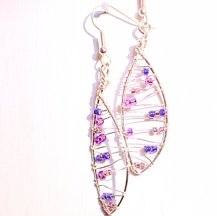 This pair of earrings were made by creating and hammering a leaf shaped base, which I wire wrapped in a loose pattern, accented with seed beads in purple and blue. The earrings have been created as a matched pair, using non tarnish silver plated wire.