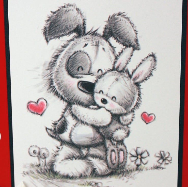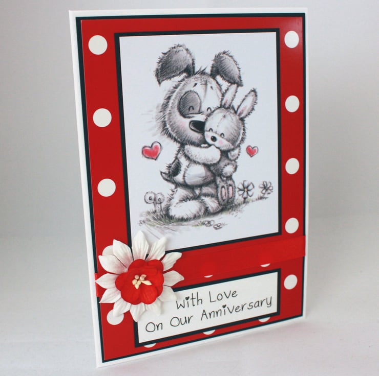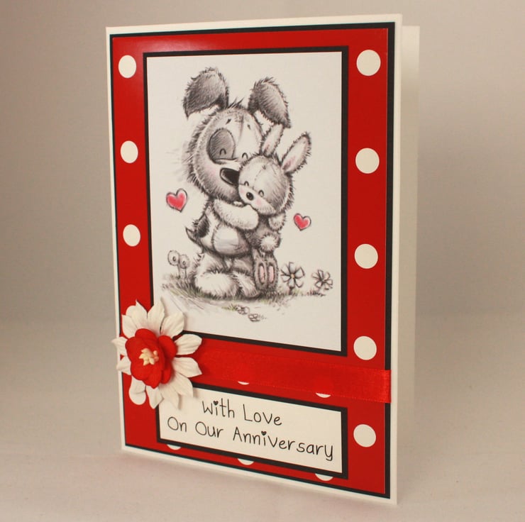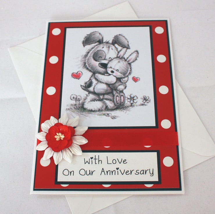 Cute anniversary card featuring an image of a dog and a rabbit hugging each other. The image has been framed in black card, along with the message 'With Love On Our Anniversary'. Both have been layered over a red and white polka dot background and the card is finished with a red satin ribbon and paper flowers.