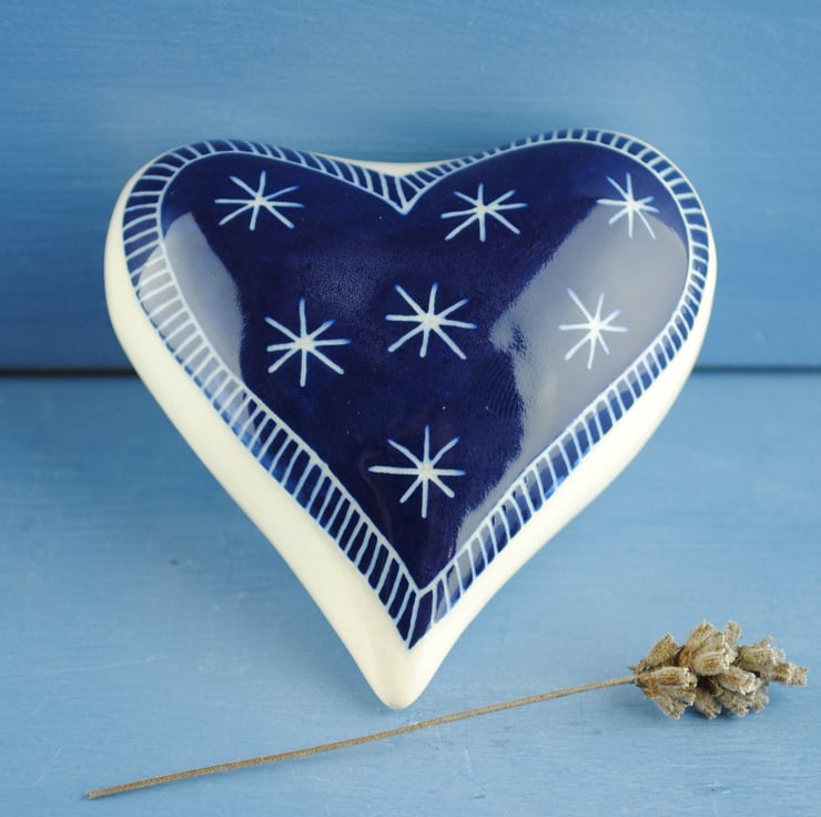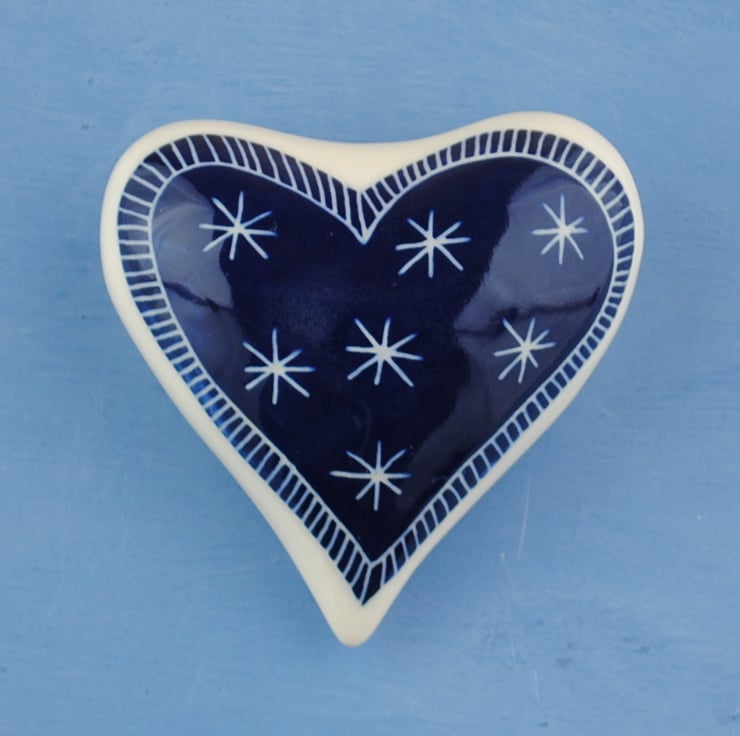 Each heart shaped pebble is hand made from white earthenware clay, decorated with coloured slip and finished with a hand drawn design using the scraffito technique.