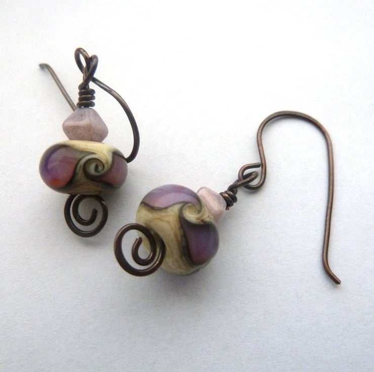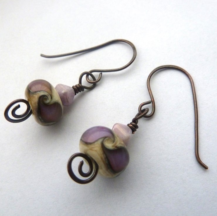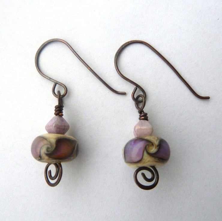 A pair of earrings made with handmade copper ear wires, handmade copper head pins, lilac Czech glass beads and handmade lampwork glass beads.